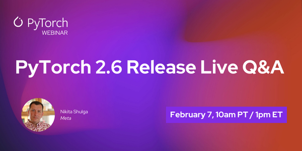 Join us for a live Q&A on PyTorch 2.6 with PyTorch Core Maintainer, Nikita Shulga (Meta). Bring your PyTorch 2.6 questions for Nikita during this live Q&A session.