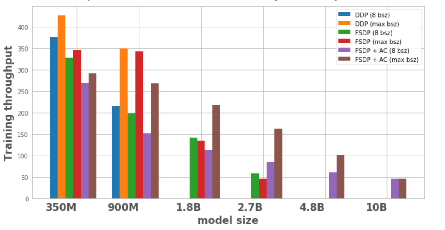 - For smaller model sizes, at a constant batch size of 8, the throughput for DDP is slightly higher than or equal to FSDP, explainable by the additional communication required by FSDP. It is lowest for FSDP and AC combined together. This is because AC re-runs checkpointed forward passes during the backwards pass, trading off additional computation for memory savings. However, in the case of the 2.7B model, FSDP + AC actually has higher throughput compared to FSDP alone. This is because the 2.7B model with FSDP is operating close to the memory limit even at batch size 8 triggering CUDA malloc retries which tend to slow down training. AC helps with reducing the memory pressure and leads to no retries.