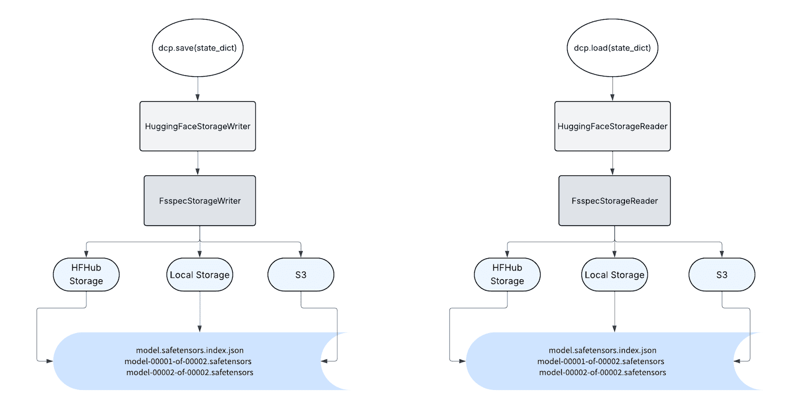 From a user’s perspective, the only change needed to use safetensors is to call load with the new load planner and storage reader, and similarly save with the new save planner and storage writer.