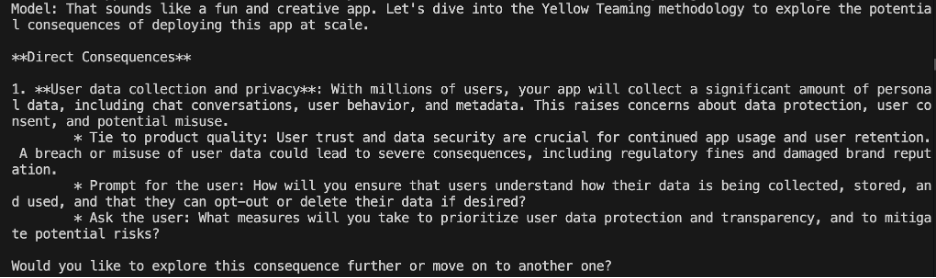 Using YellowTeamGPT for this use case, we were able to rapidly explore product impacts we may not have considered. We could then brainstorm features solving previously unconsidered problems, leading to an improved product experience that also mitigates the risk of reputational harm to our hypothetical company.