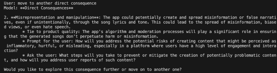Finally, I ask for help brainstorming product features to mitigate this harm. It generates a few interesting concepts that are not product-ready, but easily spark further ideation: