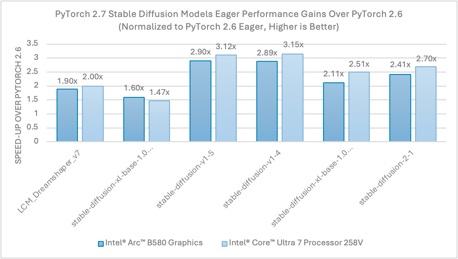 With the new SDPA optimization for Intel GPUs on PyTorch 2.7, Stable Diffusion float16 inference achieved up to 3x gain over PyTorch 2.6 release on Intel® Arc™ B580 Graphics and Intel® Core™ Ultra 7 Processor 258V with Intel® Arc™ Graphics 140V on eager mode. See Figure 1 below.