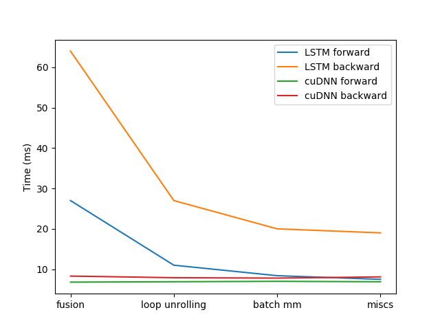 There are a number of additional optimizations that we did not cover in this post. In addition to the ones laid out in this post, we now see that our custom LSTM forward pass is on par with cuDNN. We are also working on optimizing backward more and expect to see improvements in future releases. Besides the speed that TorchScript provides, we introduced a much more flexible API that enable you to hand draft a lot more custom RNNs, which cuDNN could not provide.