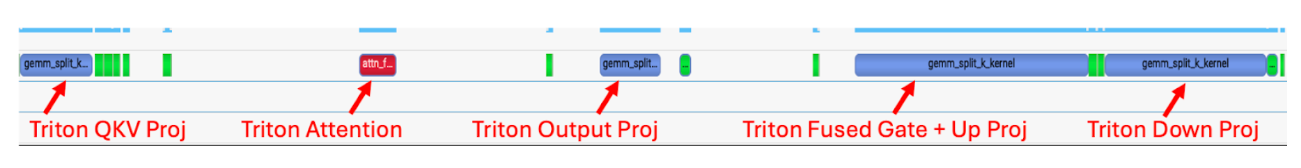For the above trace, we note that the two major ops that make up 80% of the E2E latency in a Llama3-8B style model are matrix multiplication and attention kernels and both remain CUDA kernels. Thus to close the remaining gap, we replace both matmul and attention kernels with handwritten Triton kernels.