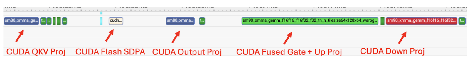 Torch.compile generates Triton kernels automatically for RMSNorm, RoPE, SiLU and Element Wise Multiplication. Using tools like Nsight Systems we can observe these generated kernels; they appear as tiny dark green kernels in-between the matrix multiplications and attention.
