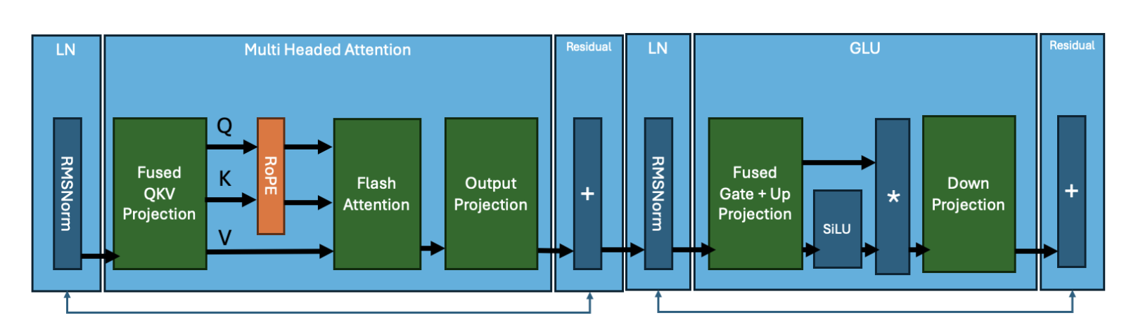 Each of these operations is computed on the GPU through the execution of one (or multiple) kernels. While the specifics of each of these kernels can vary across different transformer models, the core operations remain the same. For example, IBM’s Granite 8B Code model uses bias in the MLP layer, different from Llama3. Such changes do require modifications to the kernels. A typical model is a stack of these transformer blocks wired together with embedding layers.