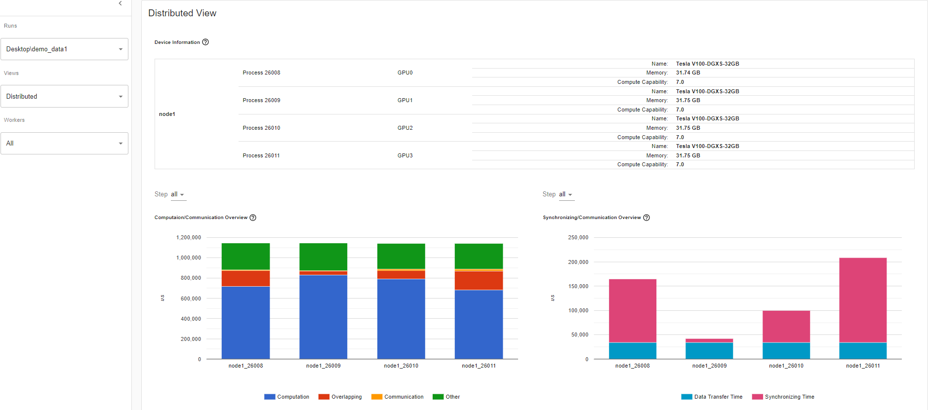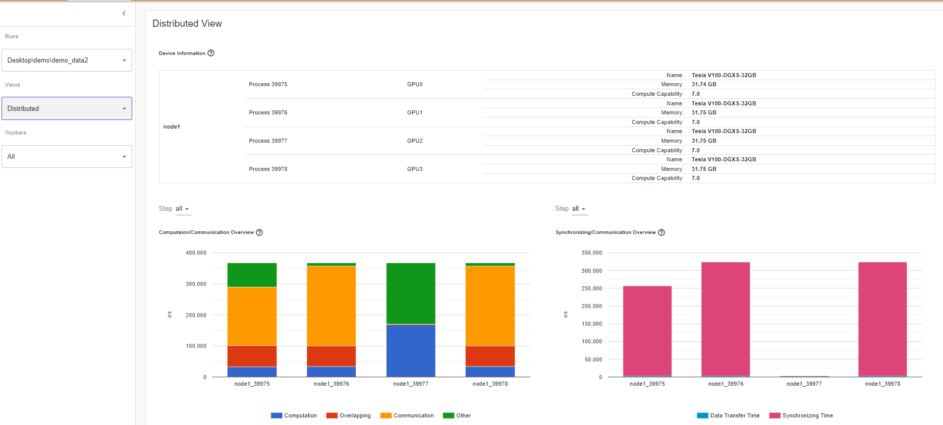- Distributed Training View: This helps you understand how much time and memory is consumed in your distributed training job. Many issues occur when you take a training model and split the load into worker nodes to be run in parallel as it can be a black box. The overall model goal is to speed up model training. This distributed training view will help you diagnose and debug issues within individual nodes.