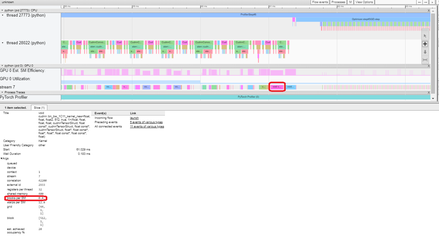 GPU utilization is calculated independently and divided into multiple 10 millisecond buckets. The buckets’ GPU utilization values are drawn alongside the timeline between 0 – 100%. In the above example, the “ProfilerStep5” GPU utilization during thread 28022’s busy time is higher than the following the one during “Optimizer.step”. This is where you can zoom-in to investigate why that is.