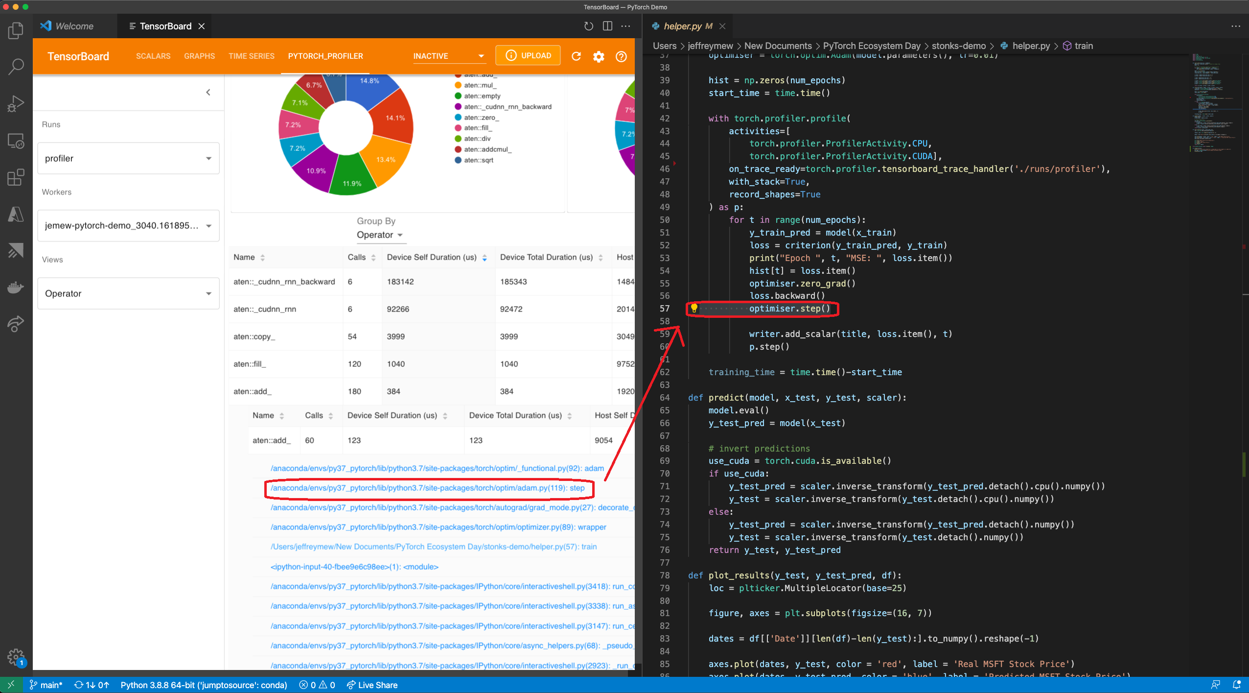 One of the great benefits of having both TensorBoard and the PyTorch Profiler being integrated directly in Visual Studio Code (VS Code) is the ability to directly jump to the source code (file and line) from the profiler stack traces. VS Code Python Extension now supports TensorBoard Integration.