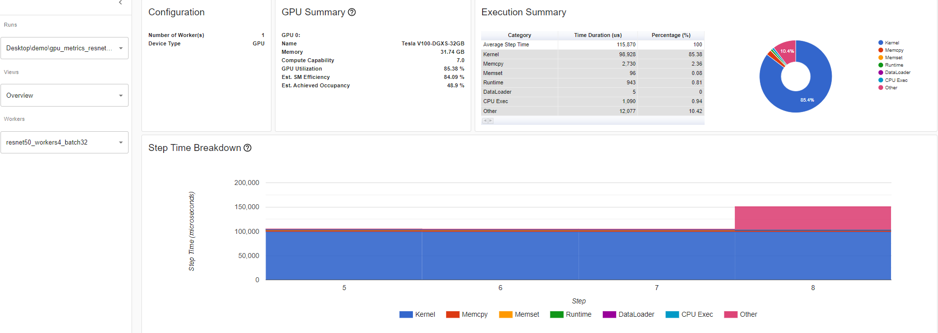 Looking of the overview page where the performance recommendation section is where you’ll find potential suggestions on how to increase that GPU utilization. In this example, GPU utilization is low so the performance recommendation was to increase batch size. Increasing batch size 4 to 32, as per the performance recommendation, increased the GPU Utilization by 60.68%.