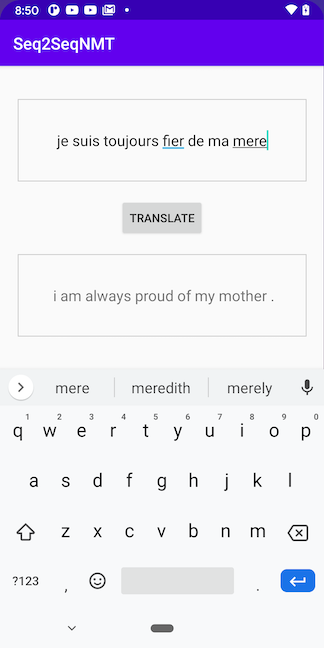 This app demonstrates how to convert a sequence-to-sequence neural machine translation model trained with the code in the PyTorch NMT tutorial for french to english translation.