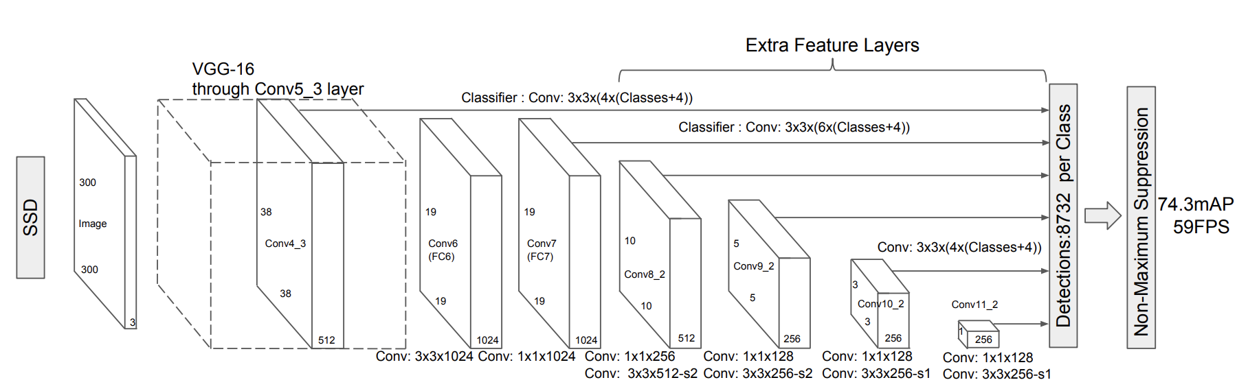 The feature extractor reconfigures and enhances a standard VGG backbone with extra layers as depicted on the Figure 2 of the SSD paper: