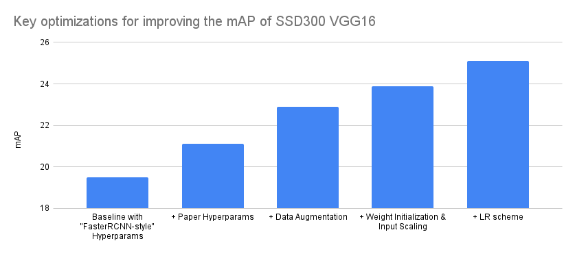 Implementing the SSD Data Augmentation strategy as described on page 6 and page 12 of the paper was critical to reproducing the results. More specifically the use of random “Zoom In” and “Zoom Out” transformations make the model robust to various input sizes and improve its precision on the small and medium objects. Finally since the VGG16 has quite a few parameters, the photometric distortions included in the augmentations have a regularization effect and help avoid the overfitting.