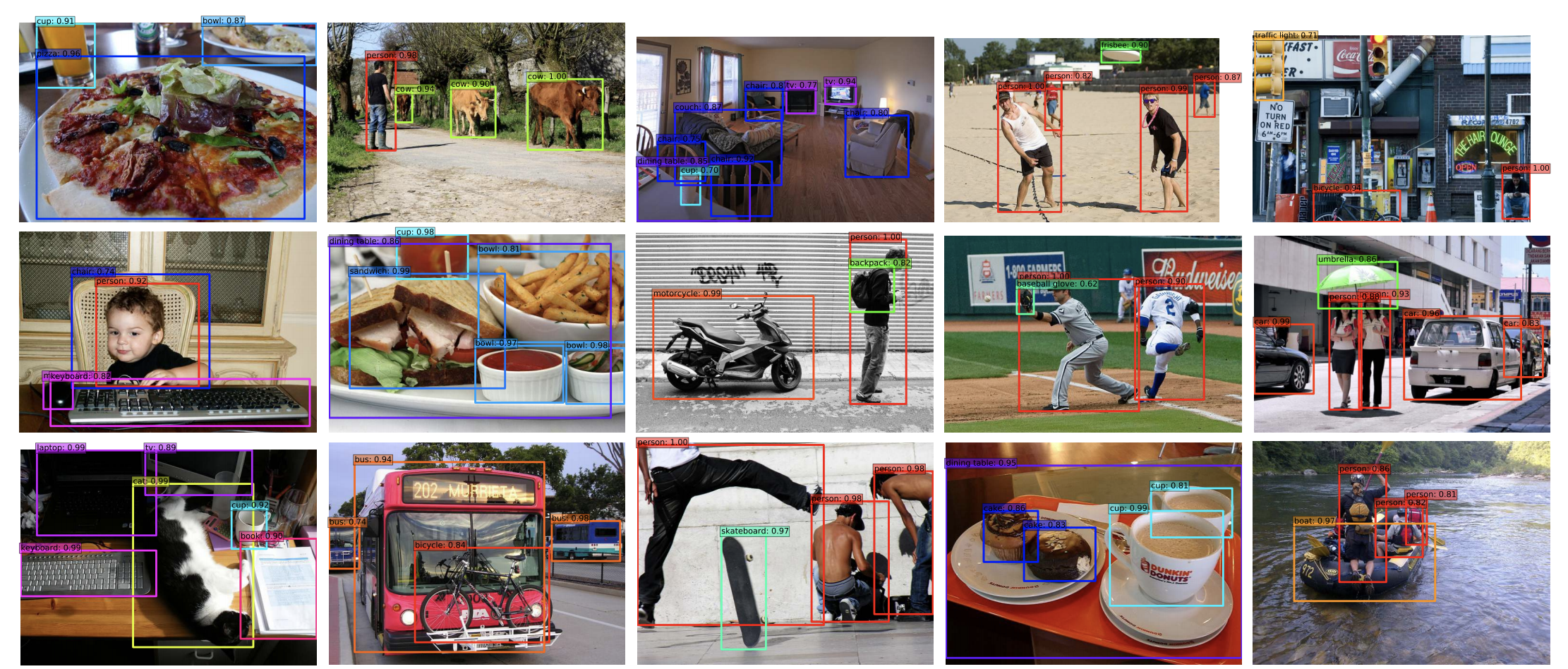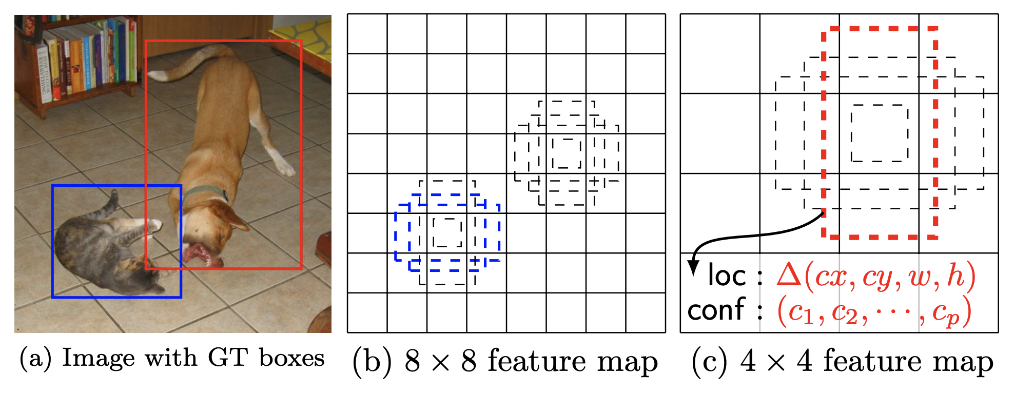 Reading the aforementioned paper is highly recommended but here is a quick oversimplified refresher. Our target is to detect the locations of objects in an image along with their categories. Here is the Figure 5 from the SSD paper with prediction examples of the model: