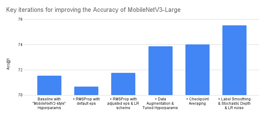 The graph and table depict a simplified summary of the most important iterations for improving the accuracy of the MobileNetV3 Large variant. Note that the actual number of iterations done while training the model was significantly larger and that the progress in accuracy was not always monotonically increasing. Also note that the Y-axis of the graph starts from 70% instead from 0% to make the difference between iterations more visible: