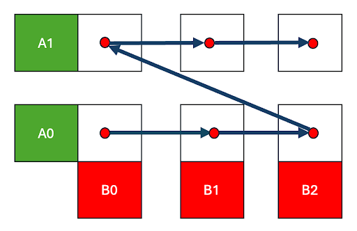 In the grouped launch schedule we hold a band of rows (=2) in Figure 3, from the A matrix in cache and traverse column-major across the output C matrix computing C(0,0) -> C(1,0) ->…-> C(GROUP_SIZE_M, 0) before moving to the next column and computing C(0,1) -> C(1,1) etc.