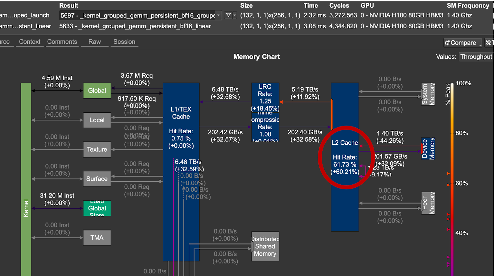 The net effect is that the grouped launch schedule increases cache performance for both A and B matrices. Consecutive Triton programs (CTAs) reuse the same B tile in quick succession while keeping a band of A rows in cache.