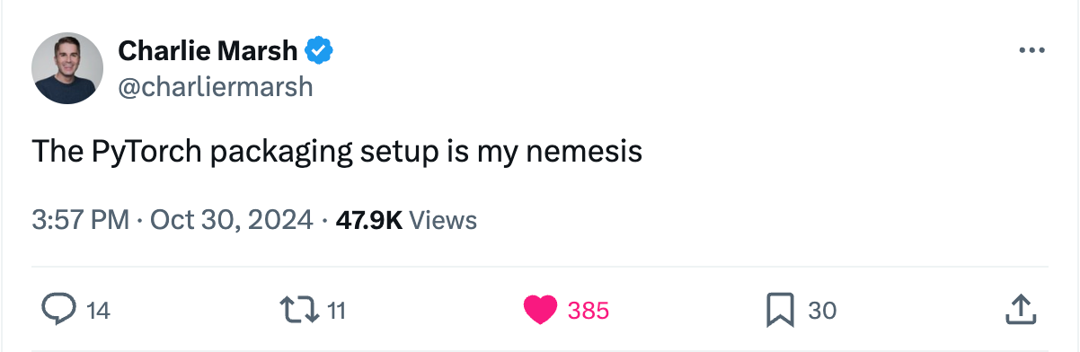 Now, this isn’t a new problem. Python packaging is notoriously difficult, and with the advent of compiled / specialized components for packages, the packaging ecosystem has needed an answer for how to make the experience better. (If you’re interested in learning more about these difficulties, I’d highly recommend reading through pypackaging native.)